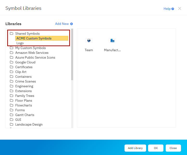 If your organization has a SmartDraw Site License, you can choose to share any custom library you create with your entire organization.