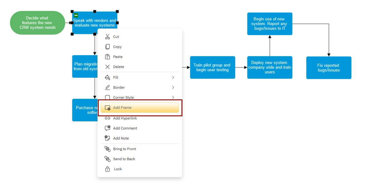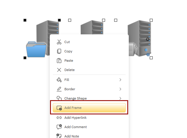 Frames allow you to move a group of shapes around your workspace. You can add a frame to any grouping of shapes using the right-click menu. Select all the shapes or diagram you want to include and choose Add Frame from the right-click menu.