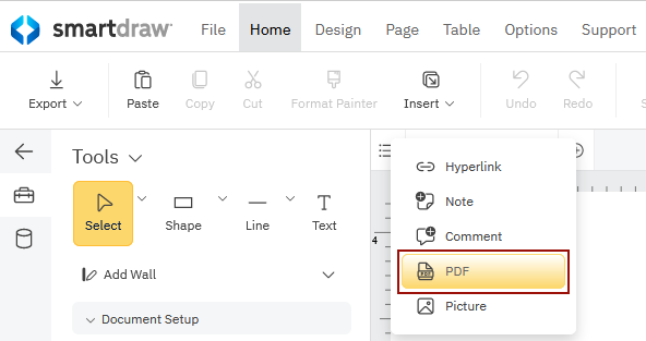You can import a PDF into SmartDraw to serve as a standalone image or a background layer. To import your PDF, click the Insert command on the Home tab and choose PDF.