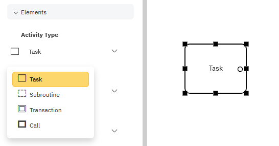Once you add an activity symbol like a task to your diagram, you can select it and change its type from the SmartPanel using the drop-down under Elements->Activity Type.