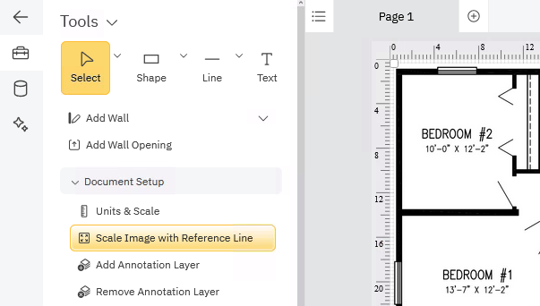 Once you picked your reference object on the imported visual, you're ready to true up the scale of your imported image and your floor plan. In the SmartPanel, to the left of your drawing area, click on Scale Image with Reference Line. This tool will help you draw a temporary line and use it to automatically match the scale of your import.