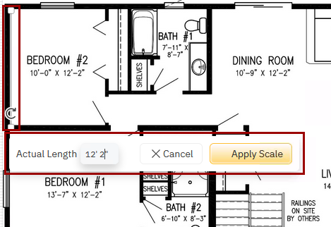 For example, if you imported a blueprint with exact room dimensions, you can draw a line along the wall of a known wall length. In the example below, we drew the line along the longer wall of Bedroom #2 and then specified that it was 12' and 2 inches in the dialog.