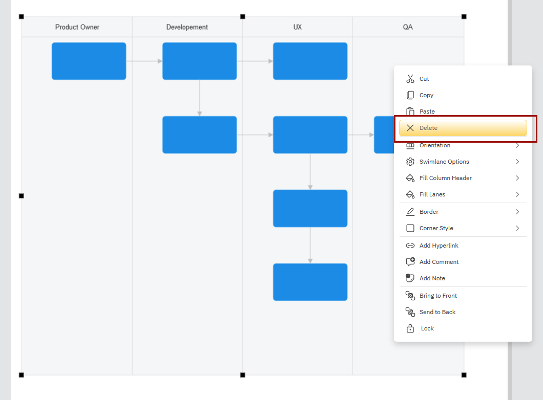If you changed your mind and you don't want to see swimlanes in your flowchart, you can remove all swimlanes without removing the rest of your flowchart by selecting the swimlane container and choosing Delete from the right-click menu.