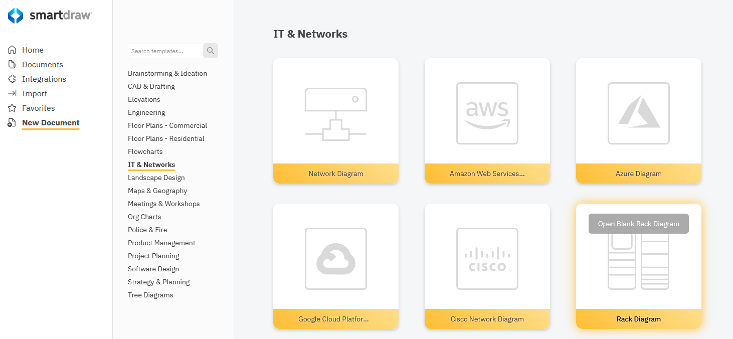 Select the Rack Diagram template from the IT & Networks category under New Document on the dashboard.