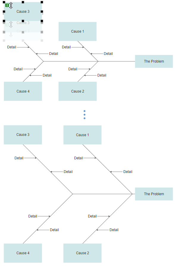 Click on one of the boxes representing a cause so you can see the green up and down arrow icon. Click and drag the box to the desired height of the branch. All branches in the cause and effect diagram will adjust accordingly.