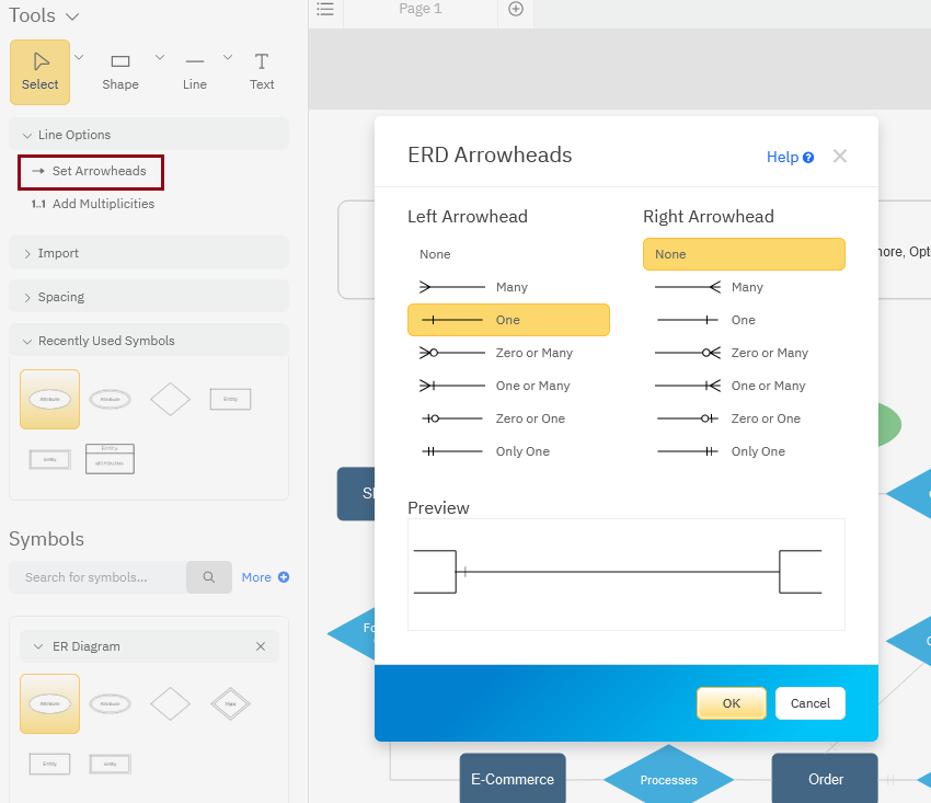 To show the relationship between classes for example in an ER Diagram, select the line and click on Set Arrowheads in the SmartPanel to bring up a dialog of arrowhead options.