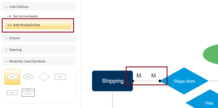 You can also add multiplicities from the SmartPanel. Select a line and click Add Multiplicities. This will drop two placeholder text objects on either end of the selected line you can edit.