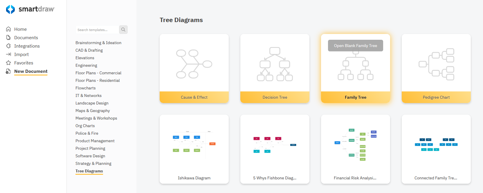 Select a Family Tree template from the Tree Diagrams category under New Document on the dashboard.