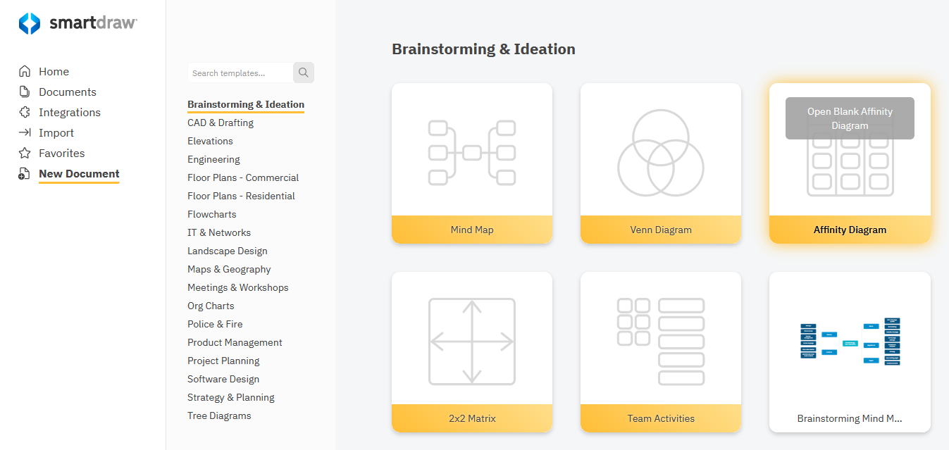 Select Affinity Diagram from the Brainstorming & Ideation category under New Document on the dashboard.