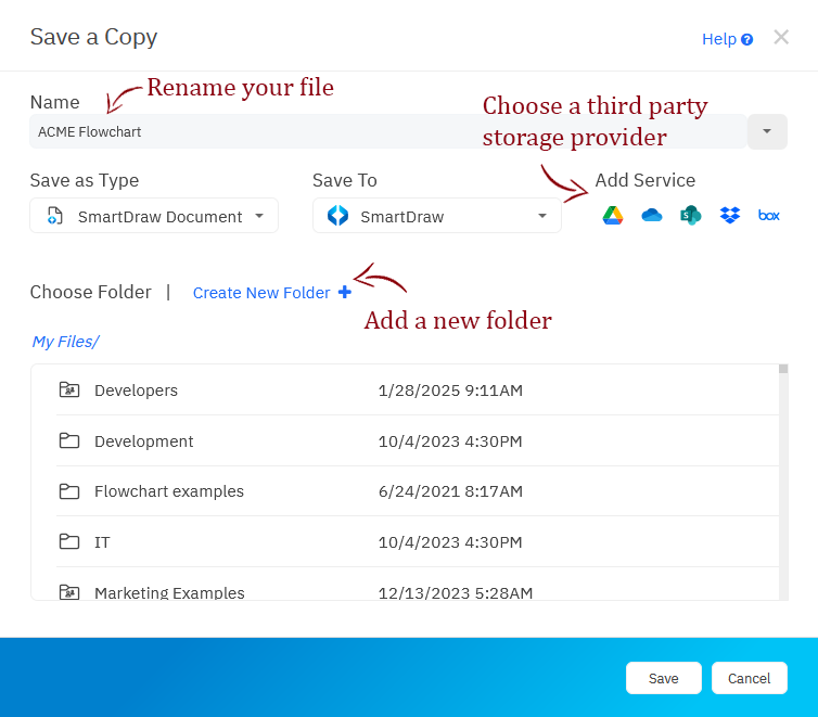 SmartDraw supports 3rd party storage options like OneDrive, Google Drive, and more. Simply connect to your preferred storage solution in this dialog if you haven't already.