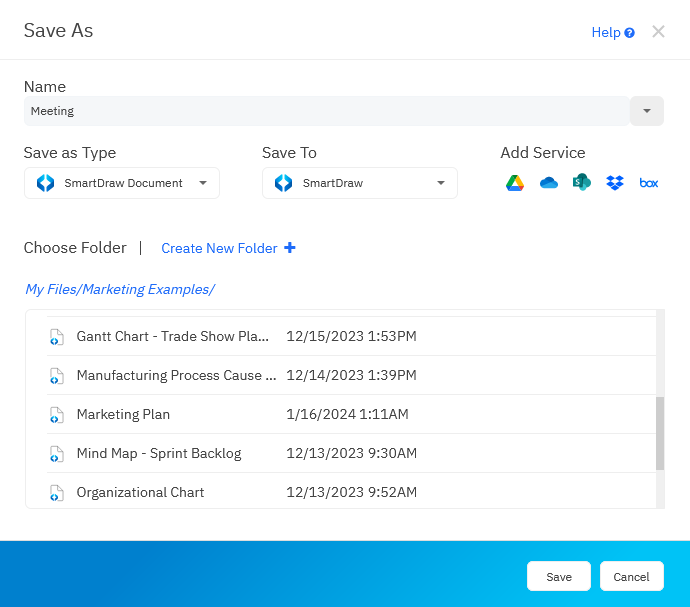 If this is the first time saving your template, you can create a name for your file and select a location if applicable like a folder or a third-party service from the Save As dialog. Hit Save.
