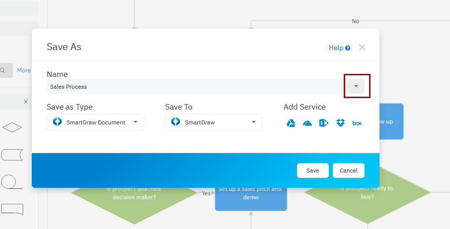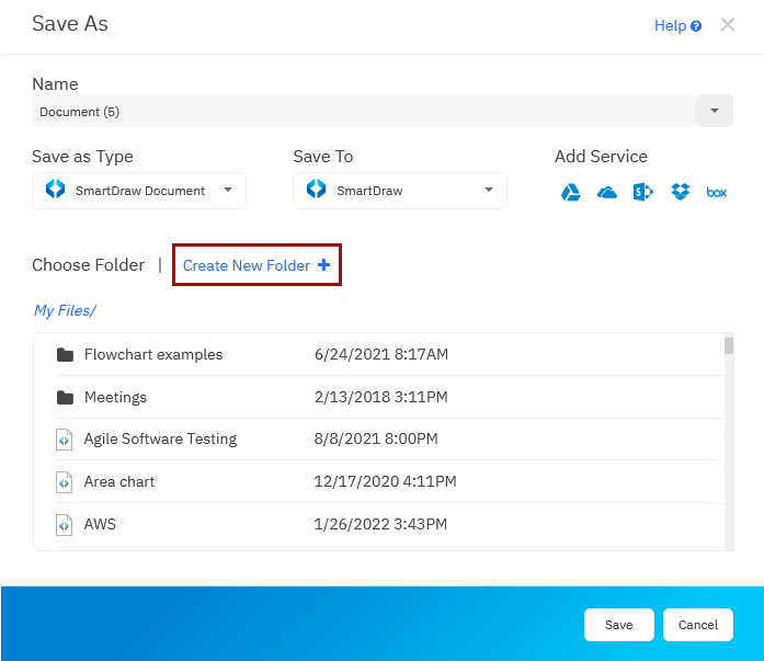 Then, select SmartDraw from the Save To drop down menu if you want to create your folder on your SmartDraw account. Next, choose Create New Folder in the the "Choose Folder" section of the dialog. You can also add other 3rd party services and create folders for those.