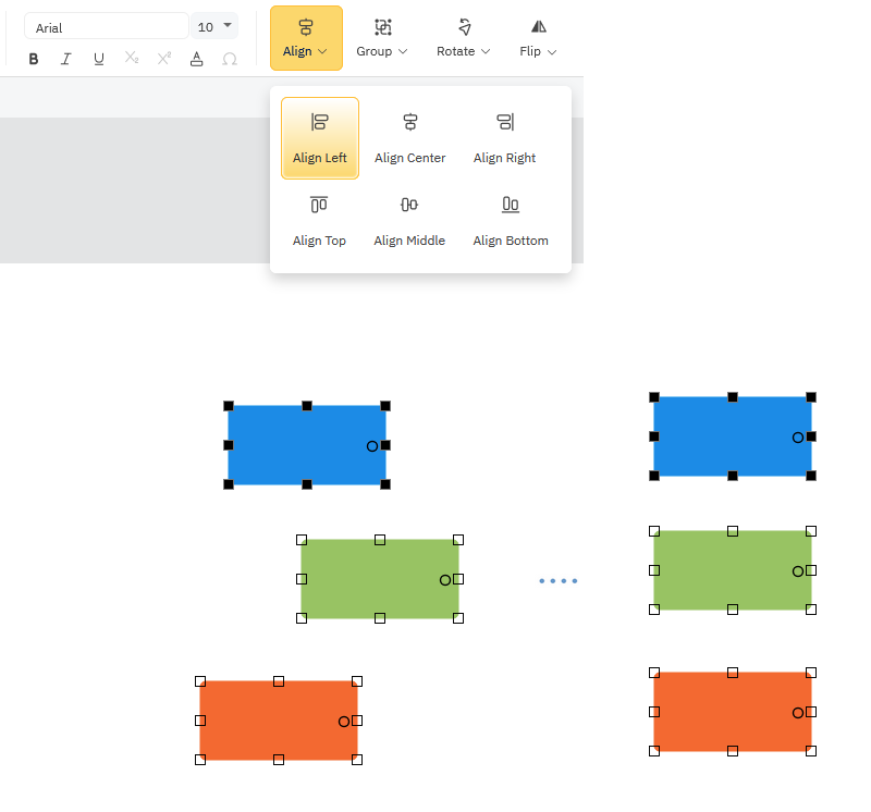 Align a group of symbols by first selecting the symbols you want to align. You can do this by drawing a selection box around them in your workspace or holding down the shift key while clicking on each symbol. The last symbol selected will have black handles and this is the symbol that will be act as the target symbol the other symbols will align to. Select an option from Align menu in the Home tab.