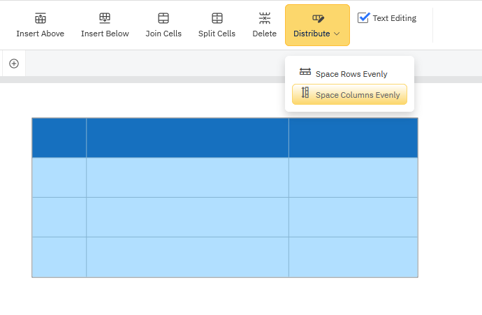 To evenly distribute cells in a table, click into a cell of the table then select from the Distribute drop-down menu in the Table tab. Choose from Space Rows Evenly or Space Columns Evenly.