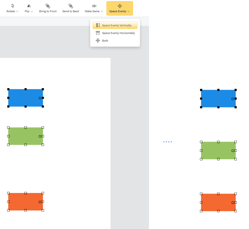 Space objects evenly in your visual by clicking on the objects within your workspace, then selecting from the Space Evenly drop-down menu. Choose from Space Evenly Vertically, Space Evenly Horizontally, or Both.