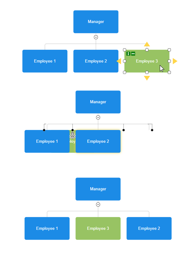 You can disconnect the shape from the line by holding down the Alt key as you move it. This only works with segmented lines or Shape Connectors in the line menu. Consider this an easy to way to rearrange or move shapes on both flowcharts: