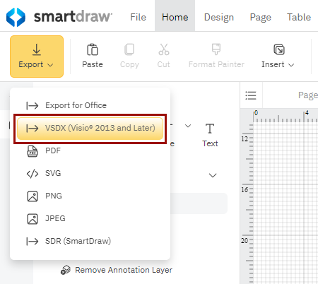Export to Visio September 09, 2024 09:03 Updated To export your diagram to Visio, go to the Home tab, click on Export and choose VSDX.