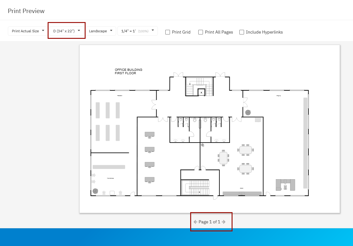If your goal is to print this diagram on a single page, choose "Print on One Page" from the drop down. You can still adjust your page size and page orientation but your scale will be reset to whatever it needs to be to make the drawing fit the size and orientation of the page you selected. Learn more about printing on one page.