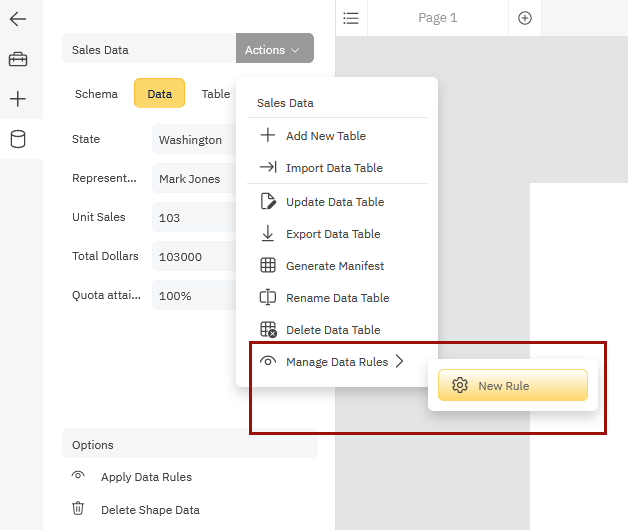 Next, click on the Actions menu, select Manage Data Rules, and choose New Rule.