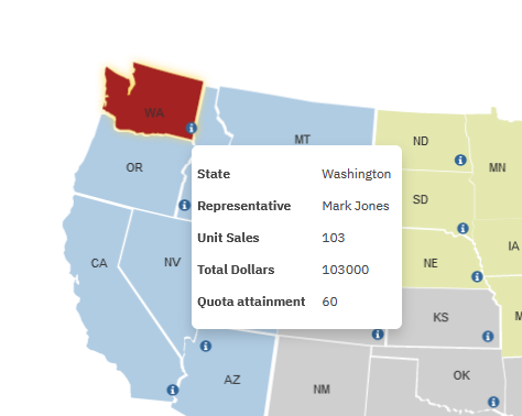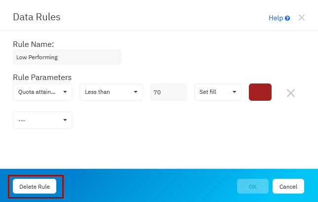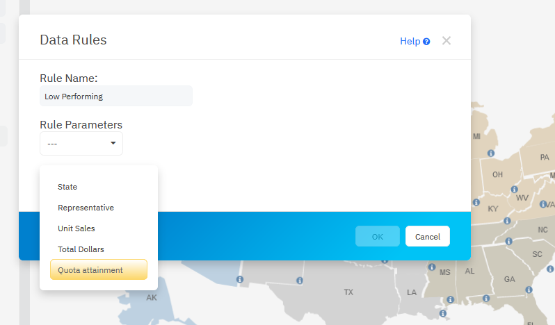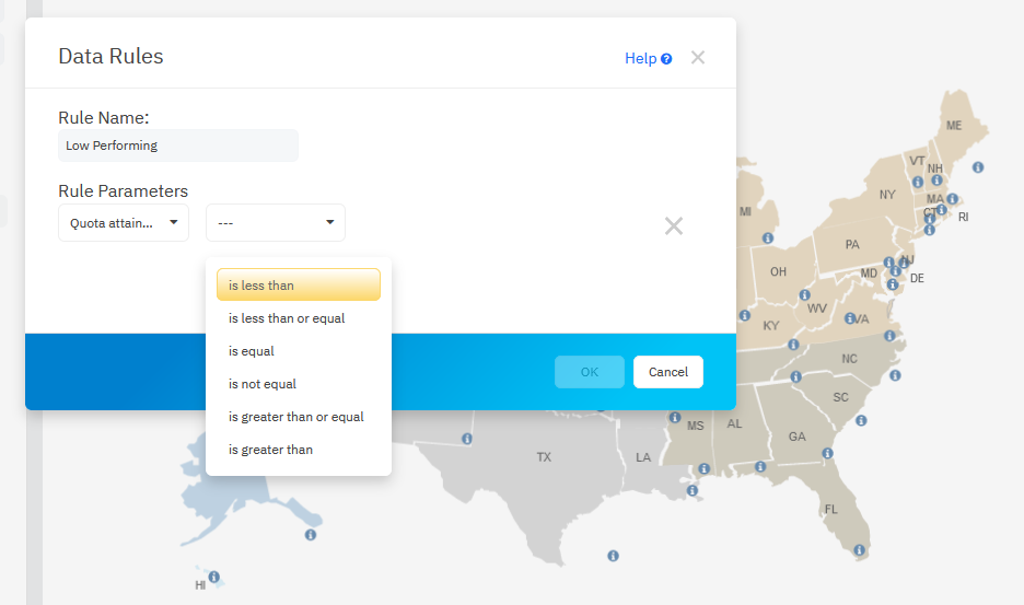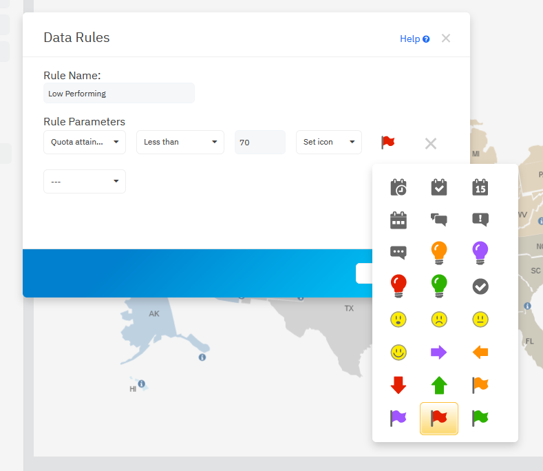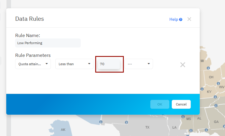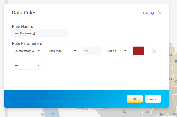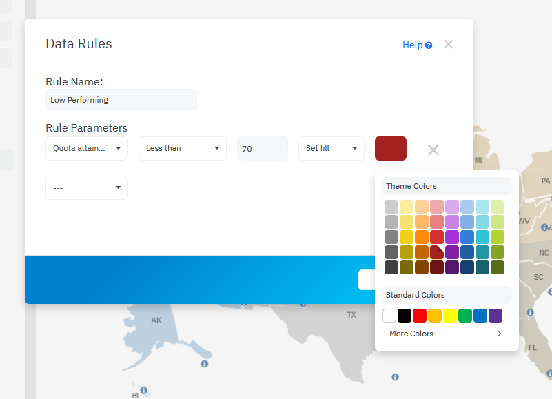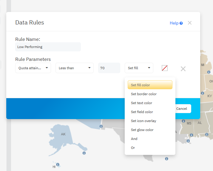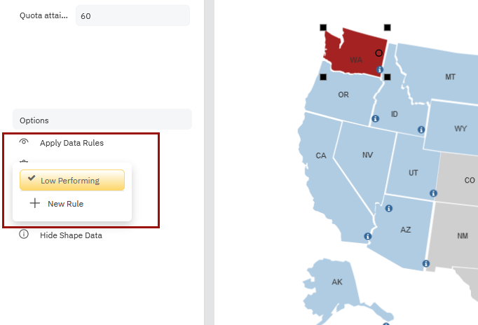 Let's look at both scenarios. Here's the data rule where we set the fill color of any shape (in this case state) to red when the quota falls below 70%. NOTE: make sure the data you're measuring against in your rule is set to be an "Integer" type, not text.