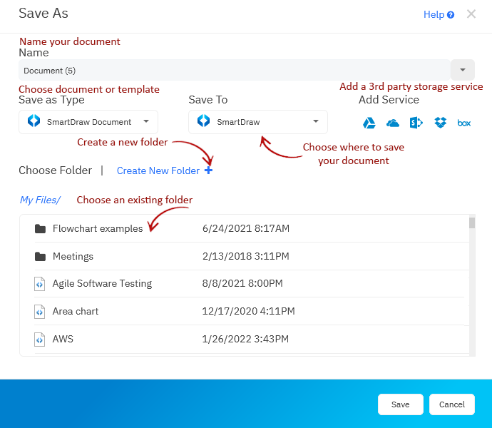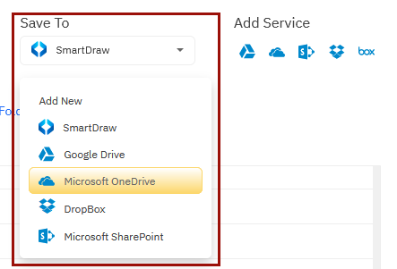 The default location for saving documents is your SmartDraw account. You can also add and save to any supported 3rd party storage solutions like Google Drive™, OneDrive®, and more. Use the drop down to choose from any already connected solutions. Click Add New to add any service.