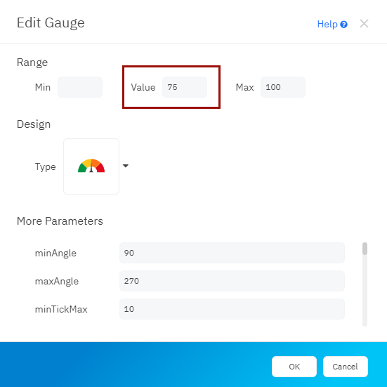 To set the value shown on the gauge you can just type in a value in the box for Value. The set the range of the gauge set the Min and Max values respectively.