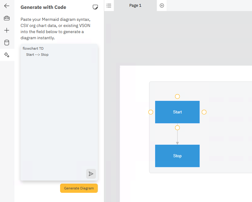 As an alternative to natural language prompts, you can use any existing structured data to generate a diagram automatically. SmartDraw currently accepts Mermaid, CSV, or VSON data. VSON is SmartDraw's proprietary scripting language for generating diagrams. You can learn more about how to write it by reading the VisualScript cookbook or consulting the VSON reference guide.
