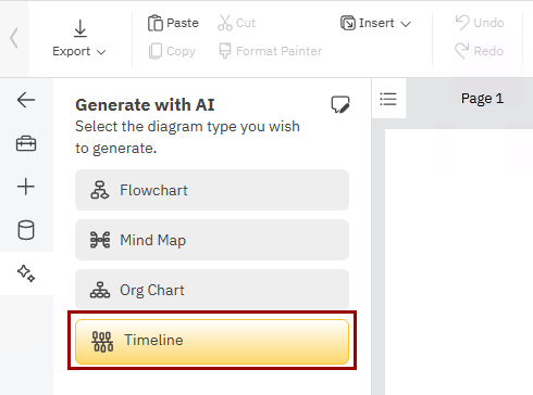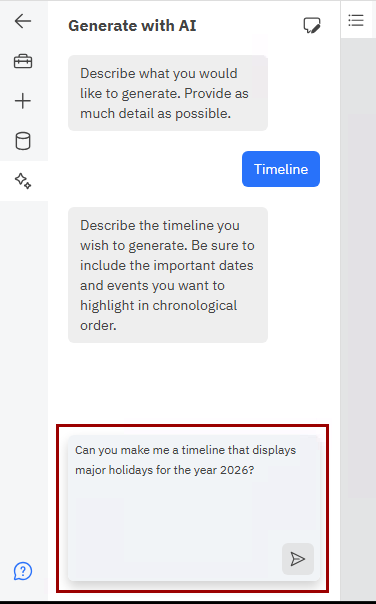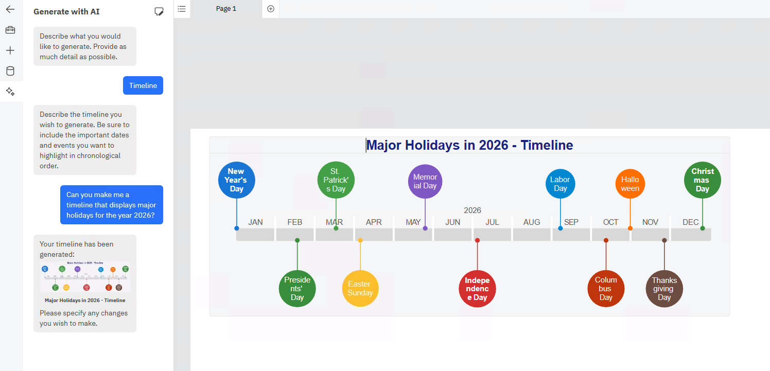 You can use SmartDraw’s AI integration to generate a timeline using natural language prompts. You can provide a list of project milestones or ask for a list of historical events or known dates.