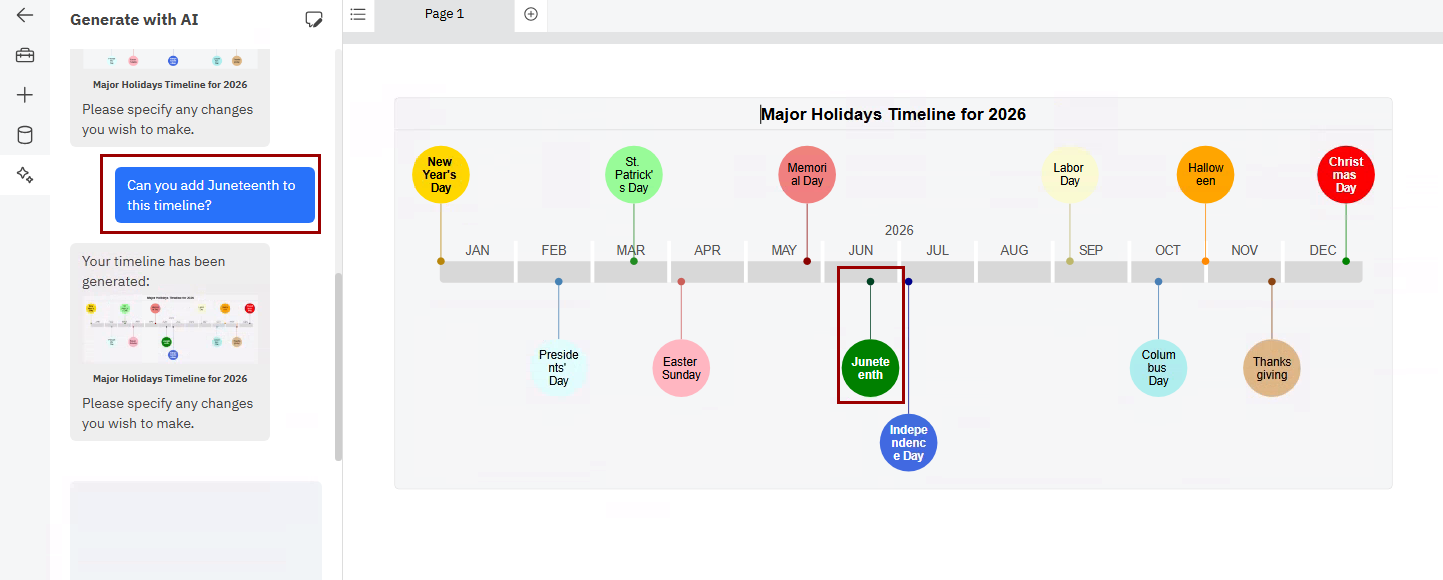 You can continue to modify the generated timeline using AI. Ask to remove or add events, change event names or dates, and so on. For example, we asked the LLM to add Juneteenth as a holiday on our timeline.