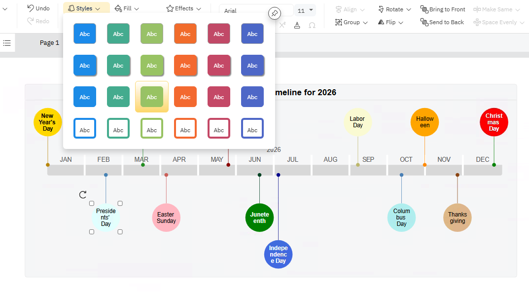Can you make me a timeline that displays major holidays for the year 2026?After the timeline is generated, a chat message will notify you, and the timeline will appear inside a frame in the drawing area on the right.