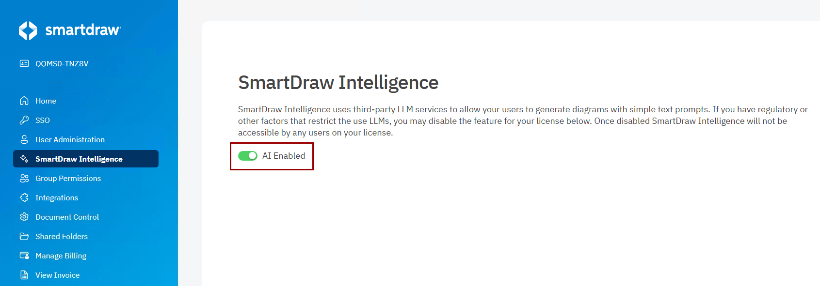 Once disabled, SmartDraw Intelligence will not be accessible by any users on your license. This toggle will work for all license types: single, Team, and Enterprise.