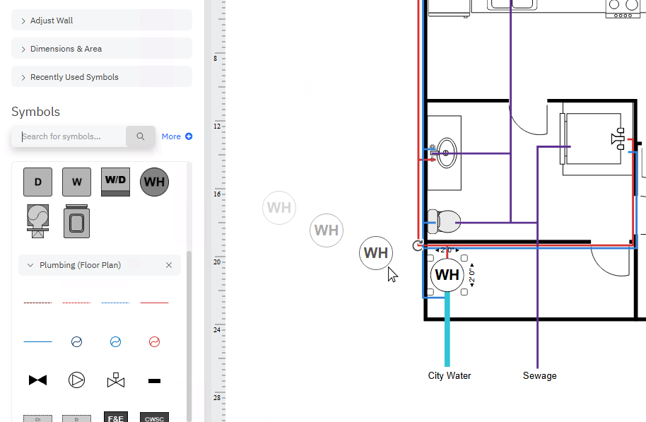 The symbols in the Plumbing library are pre-colored to represent hot and cold water. You can drag and drop them to the drawing area and then use your cursor to resize them and drag to connect them to each other.