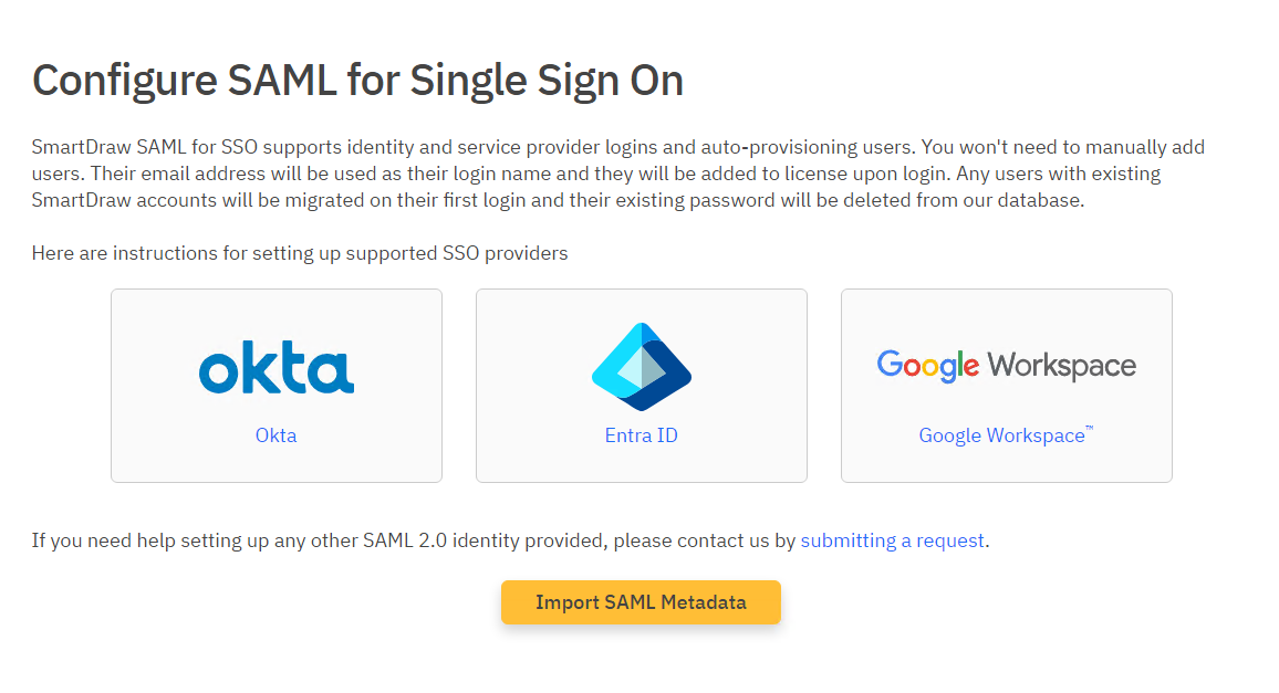 SmartDraw let's you provision your users using SSO through Microsoft Entra ID, formerly known as Azure Active Directory.