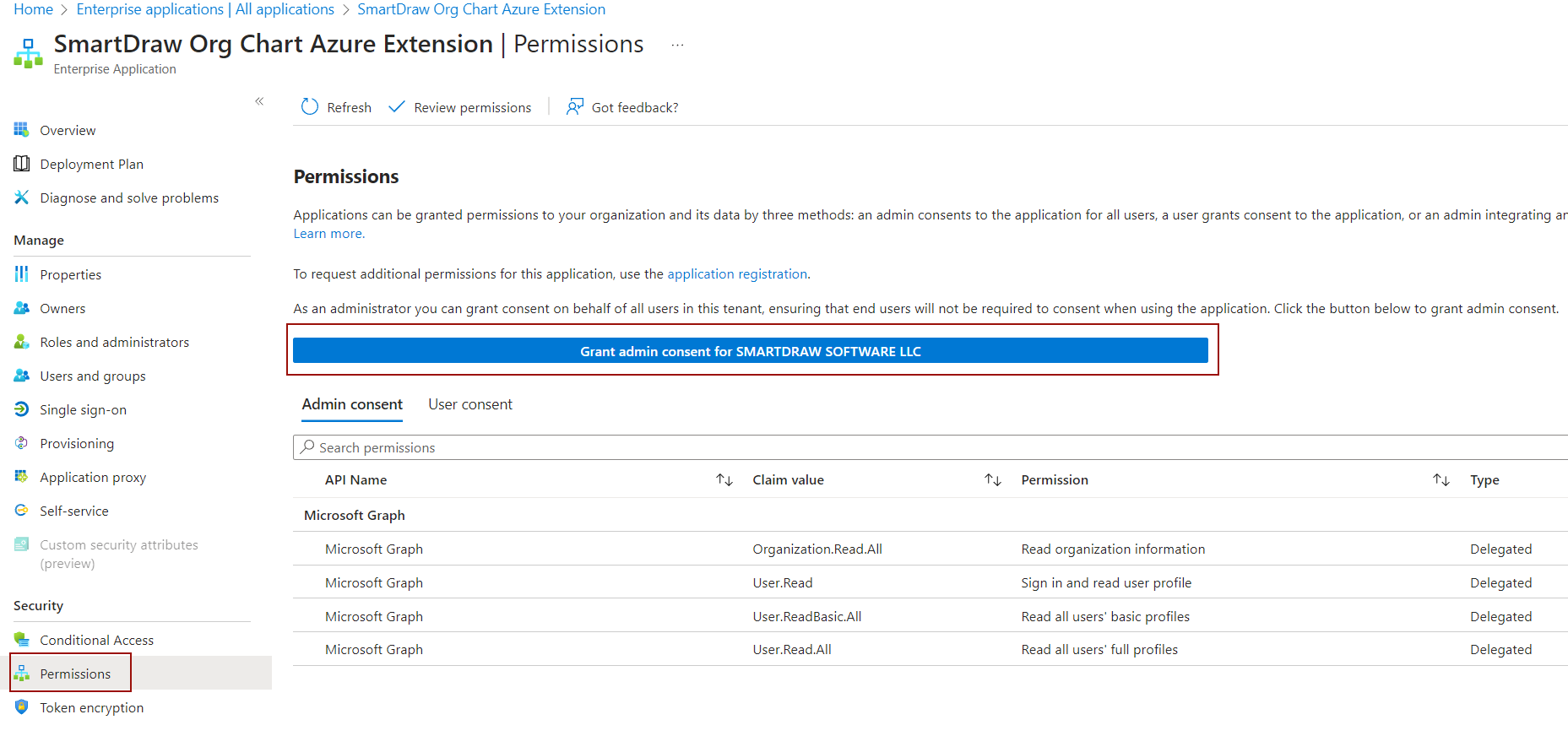 Open the SmartDraw enterprise app you are using. In this case, it will be named "SmartDraw Org Chart Azure Extension" or something very similar. Go to Permissions on the left hand navigation tree and then click the blue "Grant Admin Consent" button.