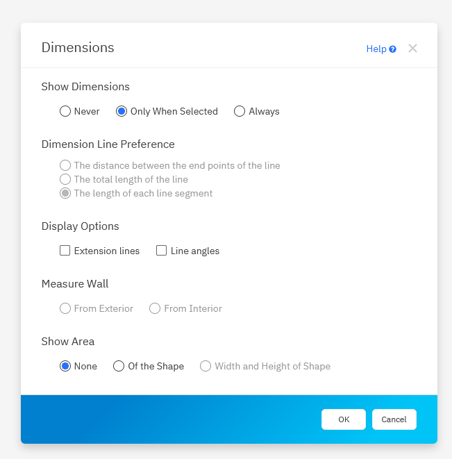 SmartDraw can show the length of any wall segment using blue extension lines that are offset from the wall itself. You can choose to show or display these extension lines using the Dimensions dialog accessible under the Design tab.